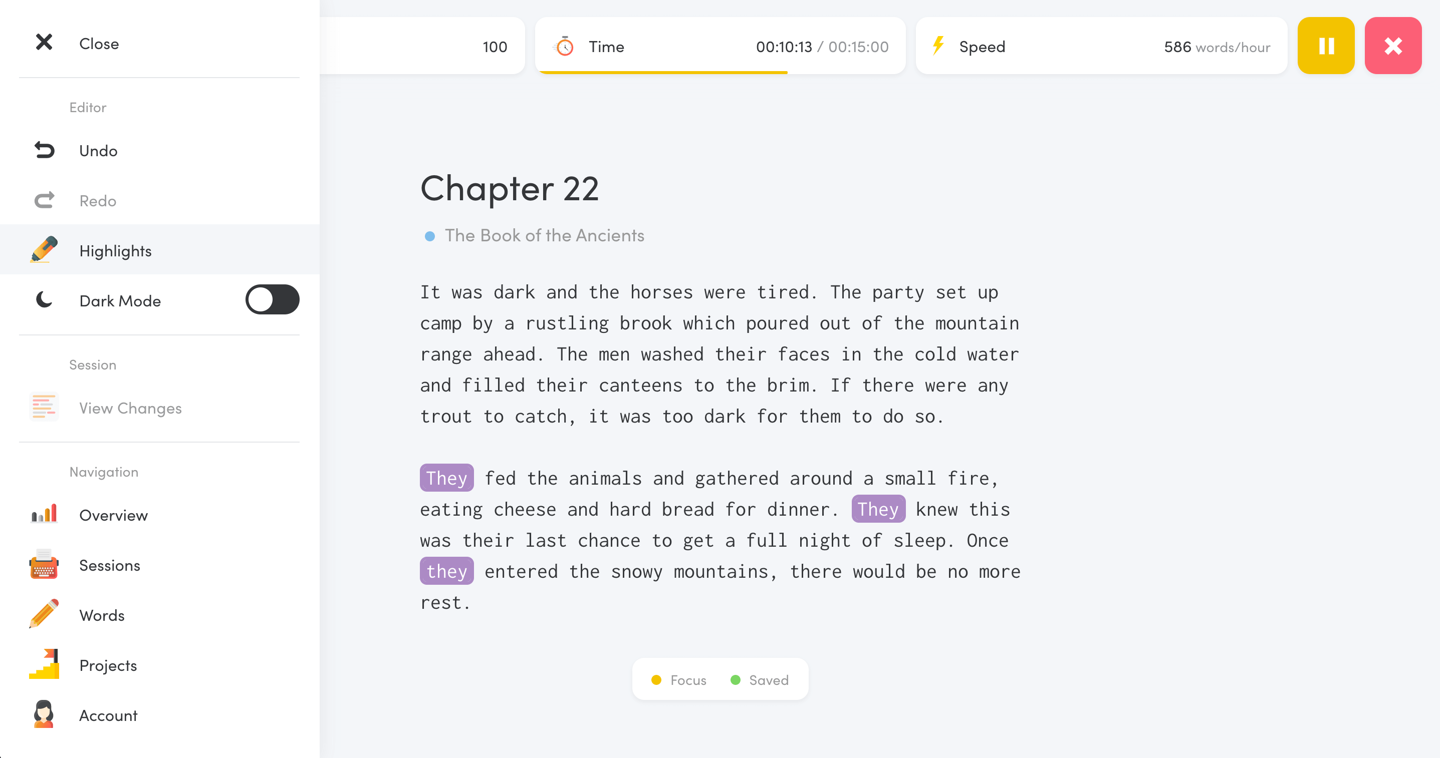 The Writing Analytics editor tracks various metrics automatically while you write. You know whether you're on track to reach your goals and can use the data to keep yourself accountable.